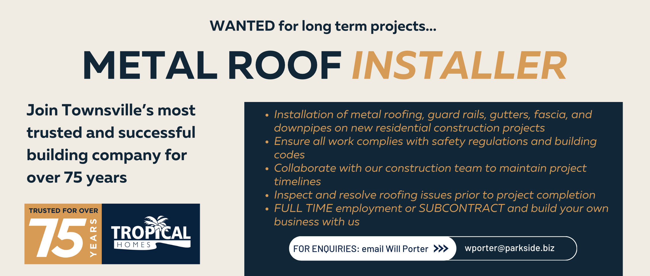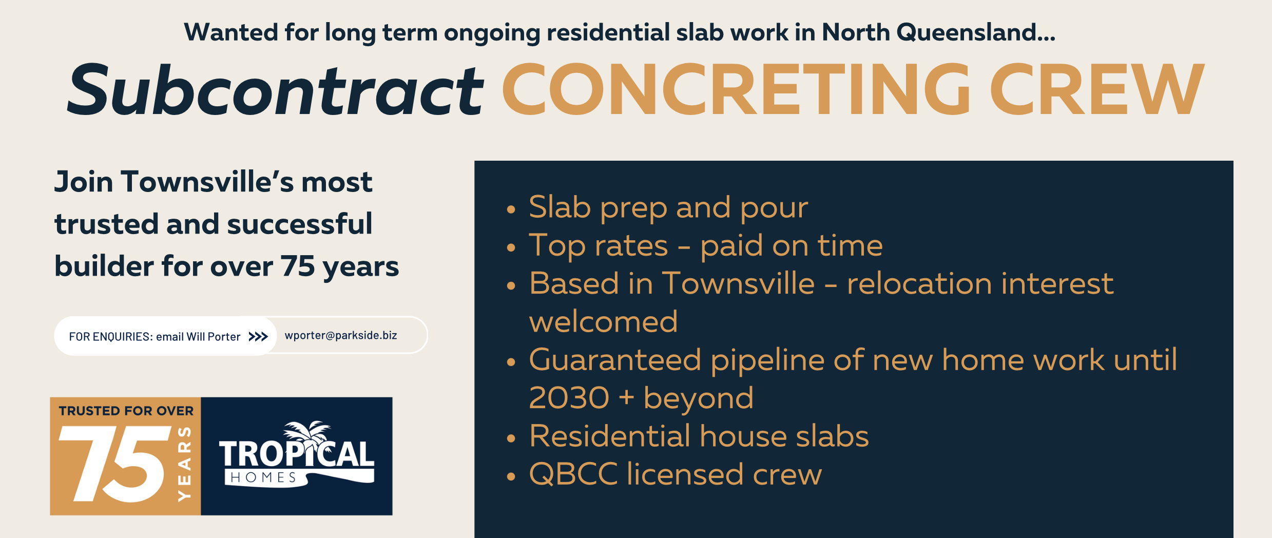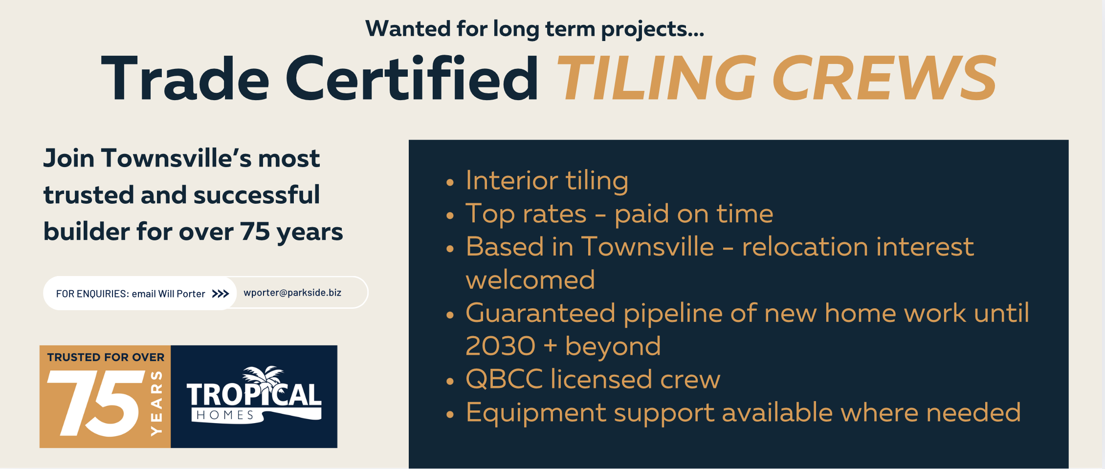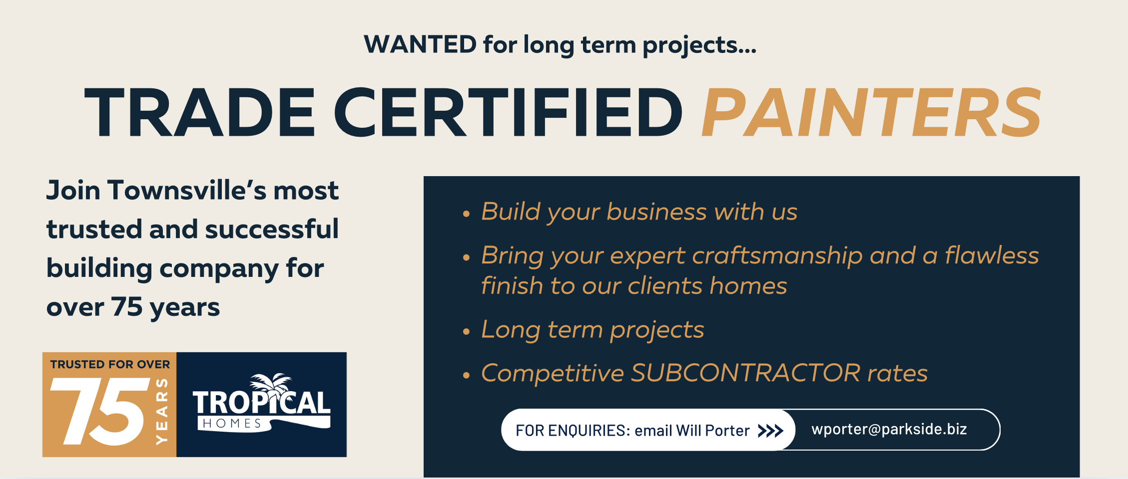 Tropical Homes is a division of the Parkside Group - a large Queensland based multifaceted and diverse company, who have been operating for over 75 years. Privately owned, Parkside is a leading player in saw milling, timber manufacturing, land and property and commercial development, home construction and retirement industries with operations across Australia and into Papua New Guinea.